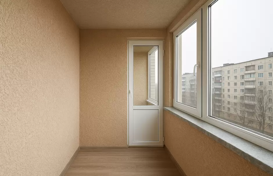 Декоративная отделка лоджии фактурой «Короед». Основание подготовлено и при необходимости выровнено, нанесена грунт-краска, сформирована фактура и выполнена окраска в выбранный оттенок. Покрытие практичное, ударостойкое и легко обновляемое. Срок — 2 дня.