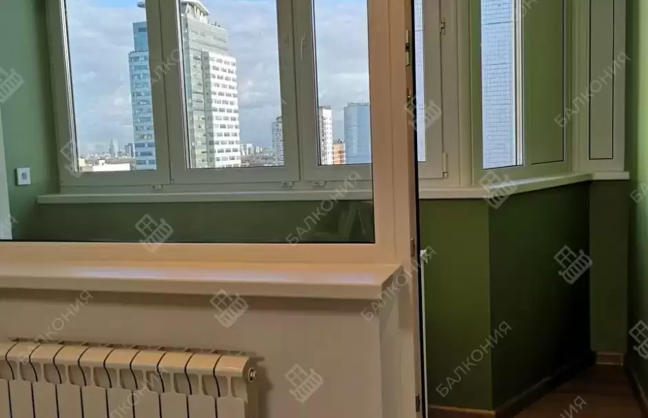 Произведена отделка балкона "сапожок" в серии дома П44 под ключ с теплым остеклением ПВХ Rehau. Сделано остекление балкона, в многоквартирном кирпичном доме. Отделка стен и потолка выполнена гипсокартоном под покраску, полы — ламинат. Материал предоставлялся компанией «Балкония» согласно пожеланиям заказчика.