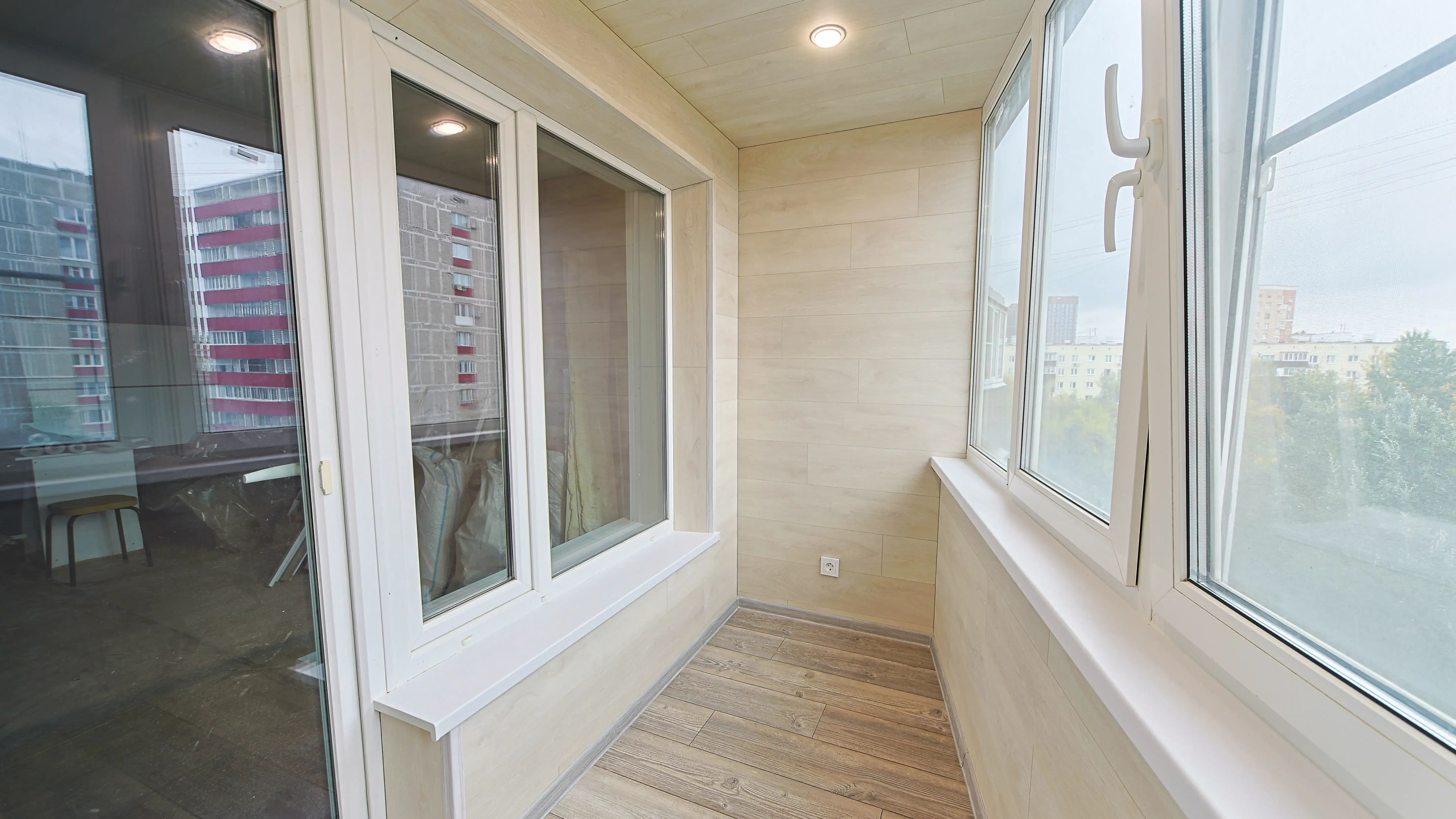 Реализованы работы по отделке балкона под ключ с утеплением, в многоквартирном доме. Сделано остекление Г-образного балкона ПВХ окнами, установлен балконный блок. Все окна выполнены из профиля Rehau Grazio 70 с энергосбережением. Сделано утепление. Отделка пола выполнена ламинатом, потолок натяжной, парапет панели ПВХ, фасадная стена покраска кирпича. Выведено на балкон и разведено электричество. Установлены светильники. Материал предоставлялся компанией «Балкония» согласно пожеланиям заказчика.