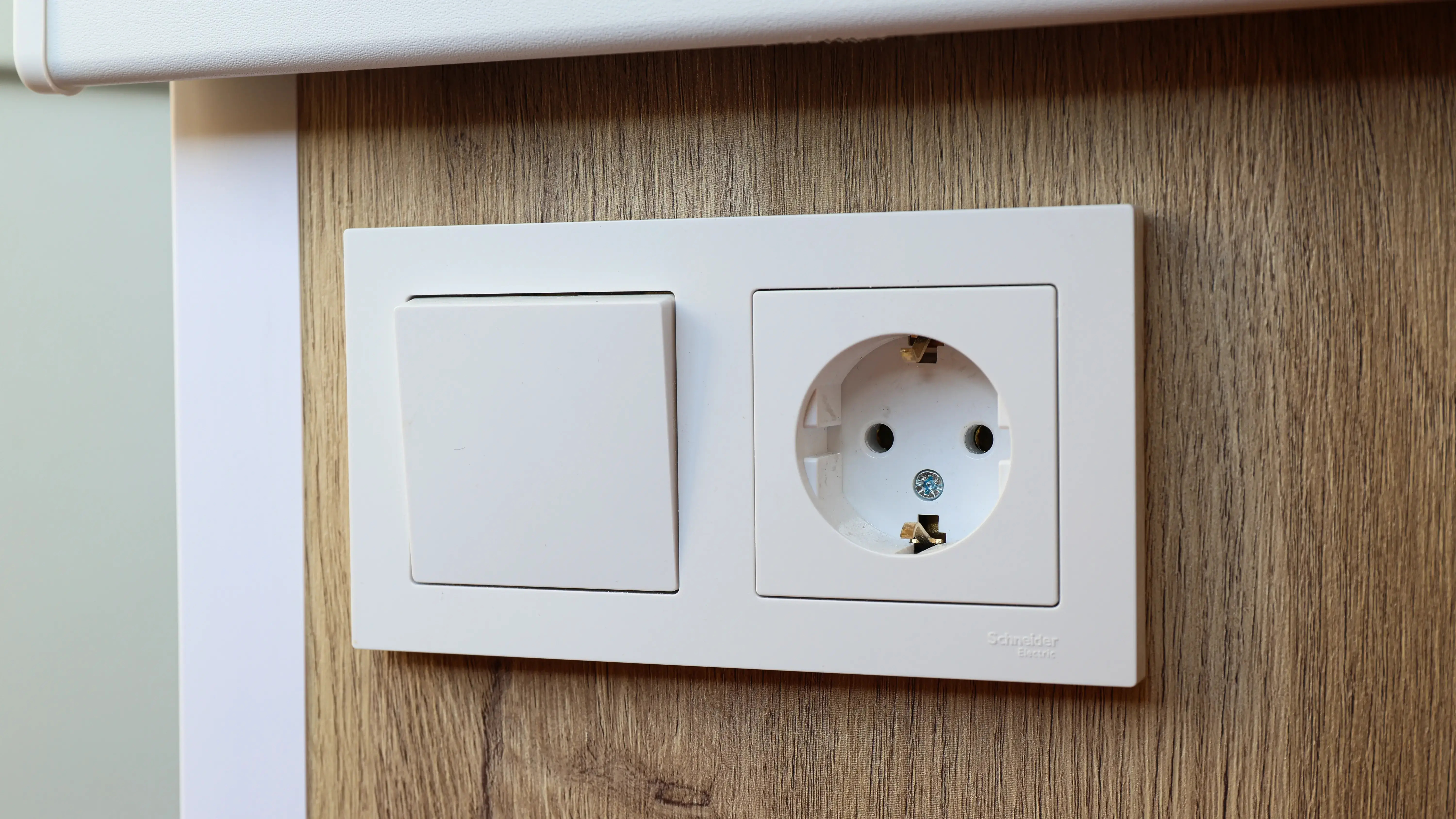 Электрика: проложена новая линия, установлен блок «выключатель + розетка» в одной рамке и три потолочных точечных светильника для равномерного освещения всей площади.
